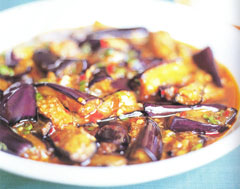 - Add aubergines to the sauce and simmer gently for a few minutes to absorb some of the flavours. Sprinkle potato flour mixture over aubergines and stir in gently to thicken the sauce. Next, stir in vinegar and spring onions and leave for a few secs until onions have lost their rawness.