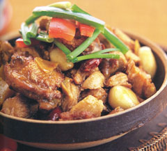 A traditional dish in the city of Changde in the north of Hunan province, where it would be presented as a table-top hotpot. If possible, do something similar using a clay pot over a table-top burner so that the dish continues to sizzle during the meal. If this is not possible, then allow a little time for the final ingredients to cook slightly before serving. It would normally be made with chicken on the bone, but works almost as well with boned chicken pieces (preferably a mix of breast and thigh).