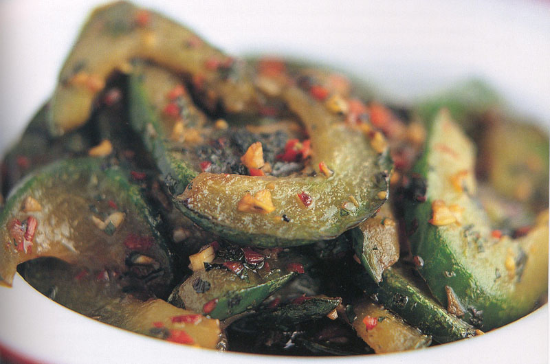 An extraordinary way of cooking cucumber, which brings out a most unexpected side to the vegetable. It is sizzled in oil with garlic and chilli, seasoned with soy sauce and vinegar, and then scattered with leaves of purple perilla.