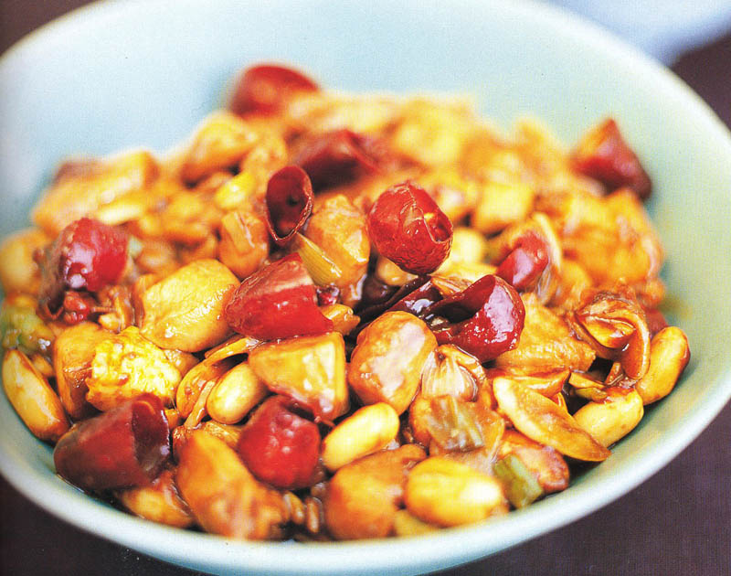 A glorious medley of chicken pieces, golden peanuts and bright red chillies. The sauce is based on a light sweet-and-sour, pepped up with a deep chilli spiciness and a trace of Sichuan pepper. The ingredients are all of a similar size and the chicken needs to be just cooked and succulent. The nuts are added at the very last minute so that they remain crisp.