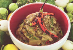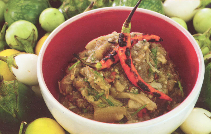 - Grill the chillies, aubergines, shallots and garlic until the skins are charred. Remove from grill and cool. Then peel the aubergines, shallots and garlic and roughly chop.